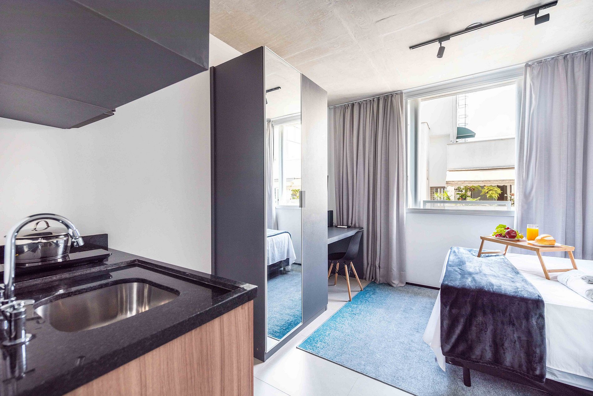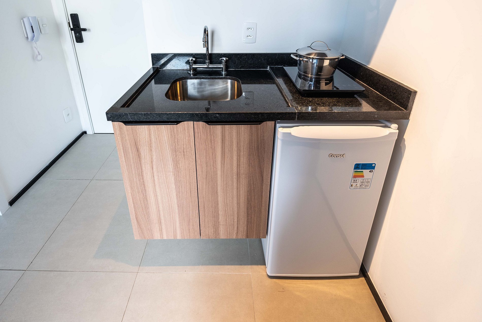 Hospede-se ao lado do Shopping Frei Caneca, em um condomínio que oferece piscina, academia, lavanderia e estrutura pensada para uma estadia prática e confortável.