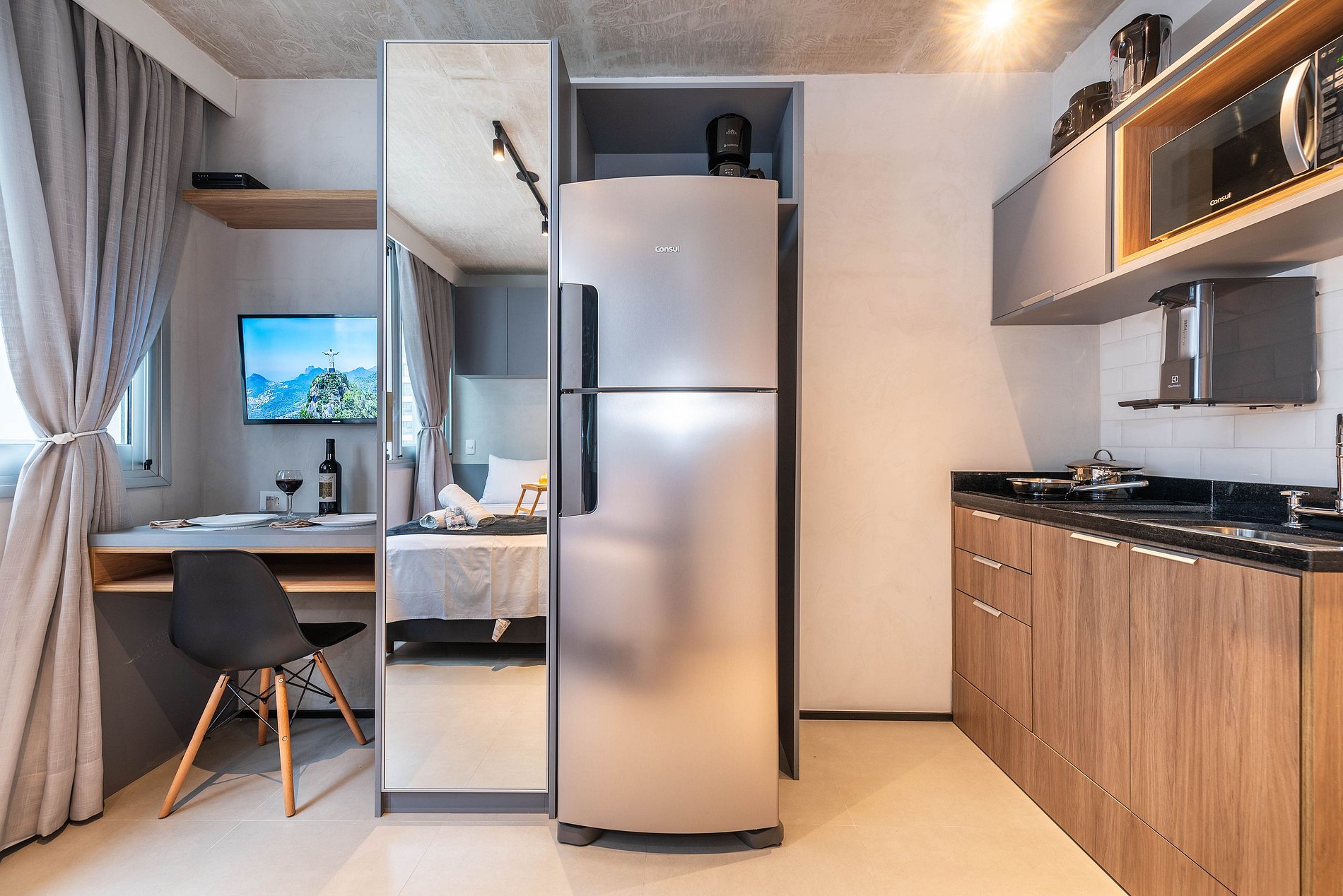 ・Cozinha completa: equipada com geladeira, fogão de indução, micro-ondas etc.