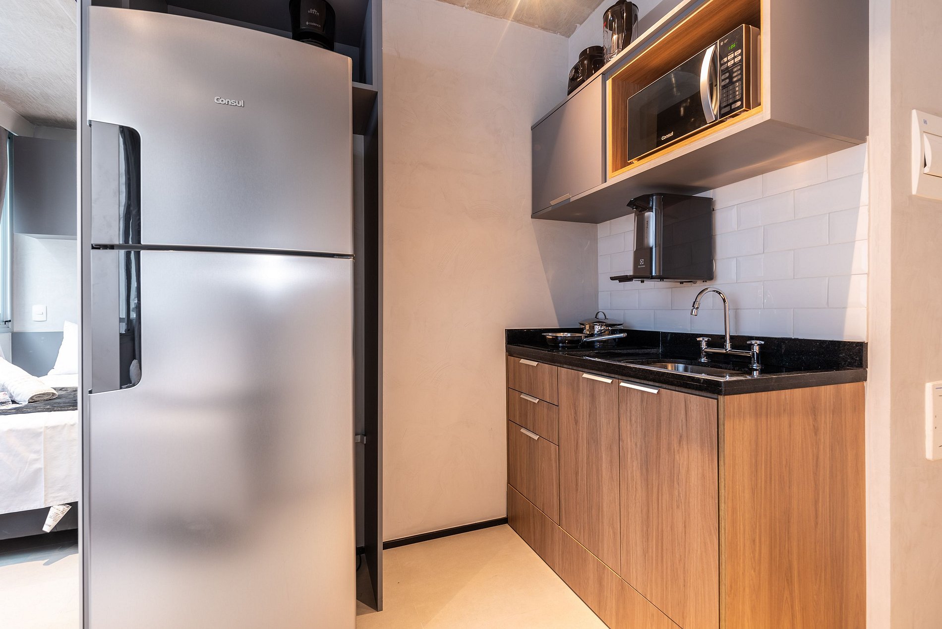 ・Cozinha completa: equipada com geladeira, fogão de indução, micro-ondas etc.