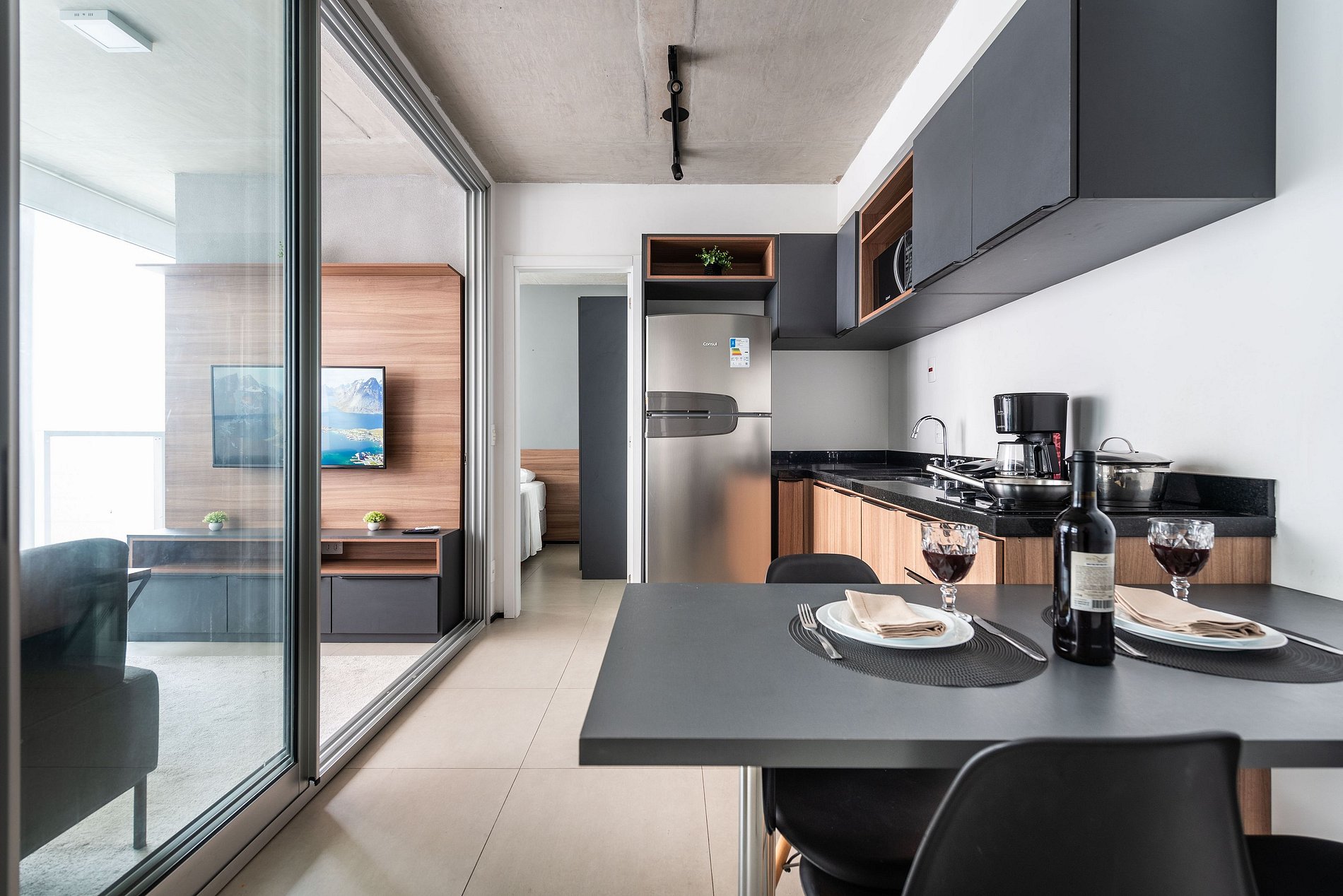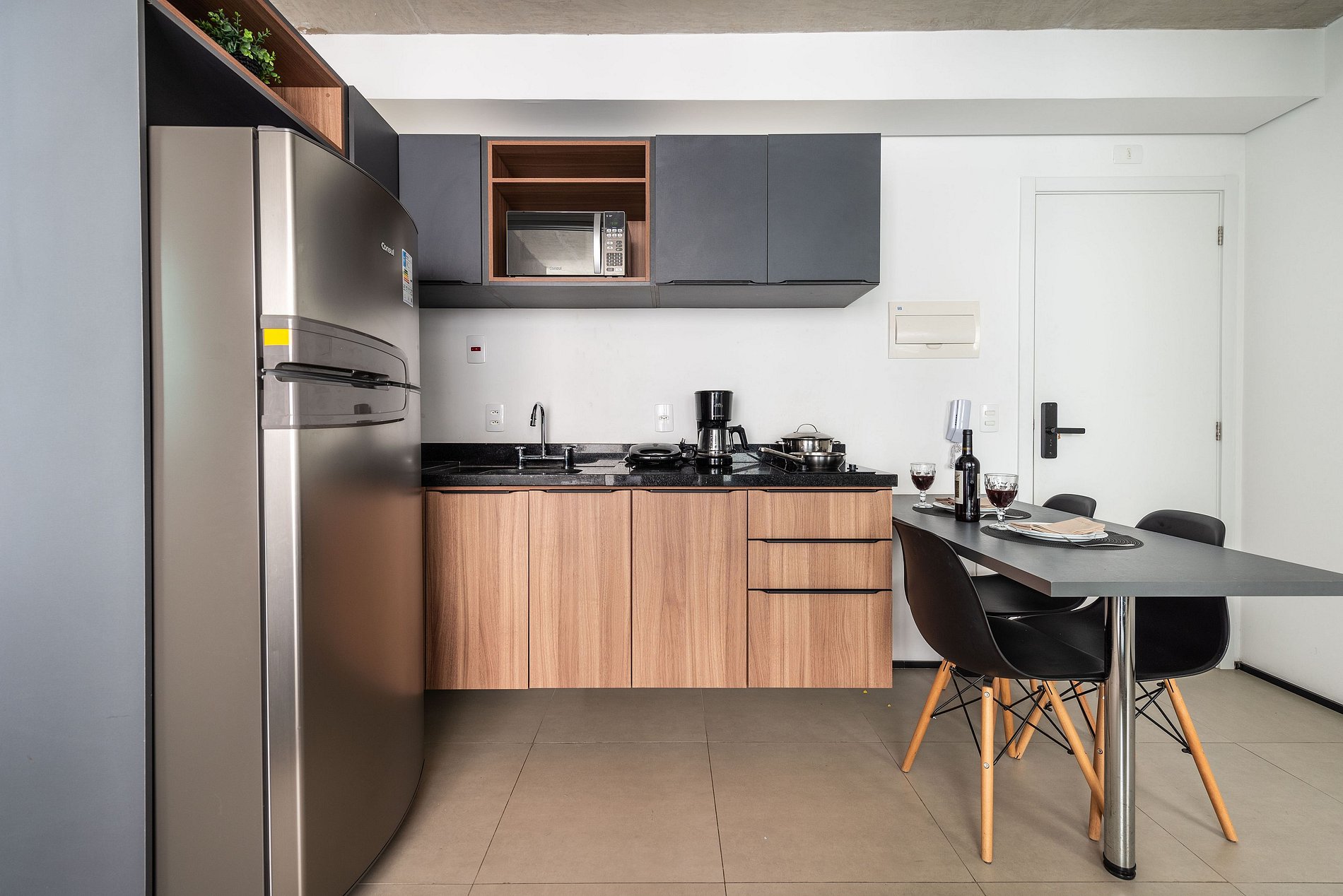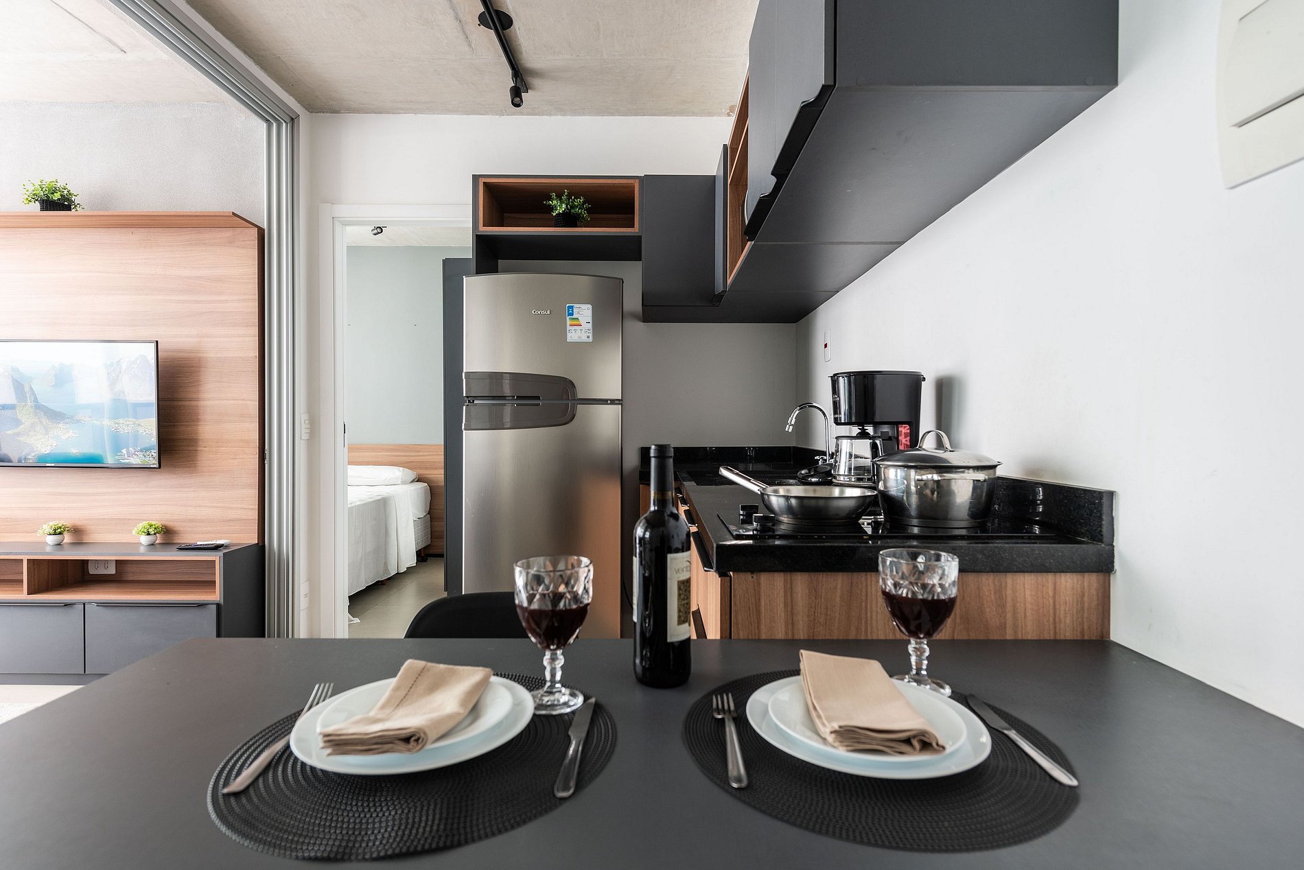 ・Cozinha completa: equipada com frigobar, fogão de indução (uma boca), micro-ondas etc.