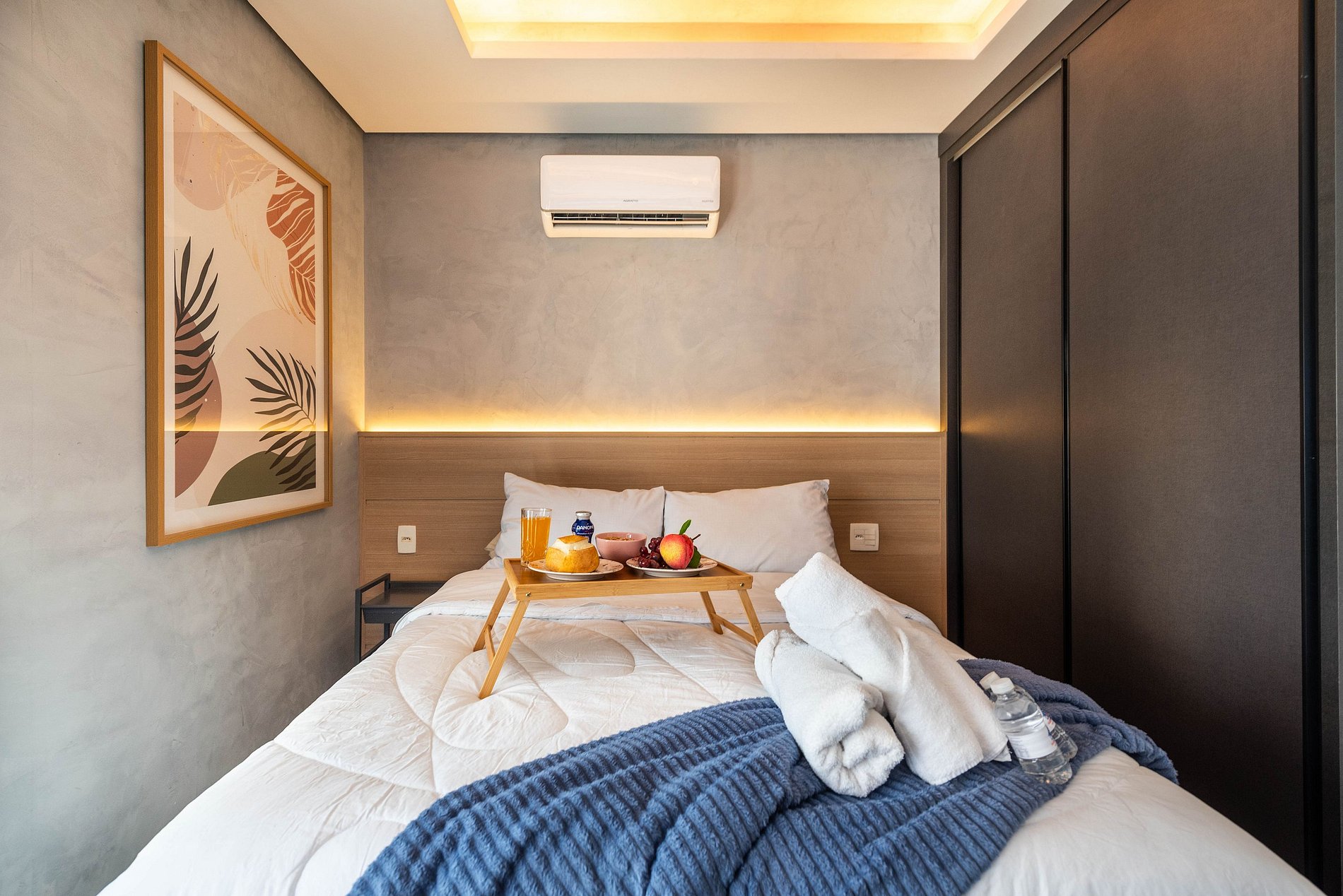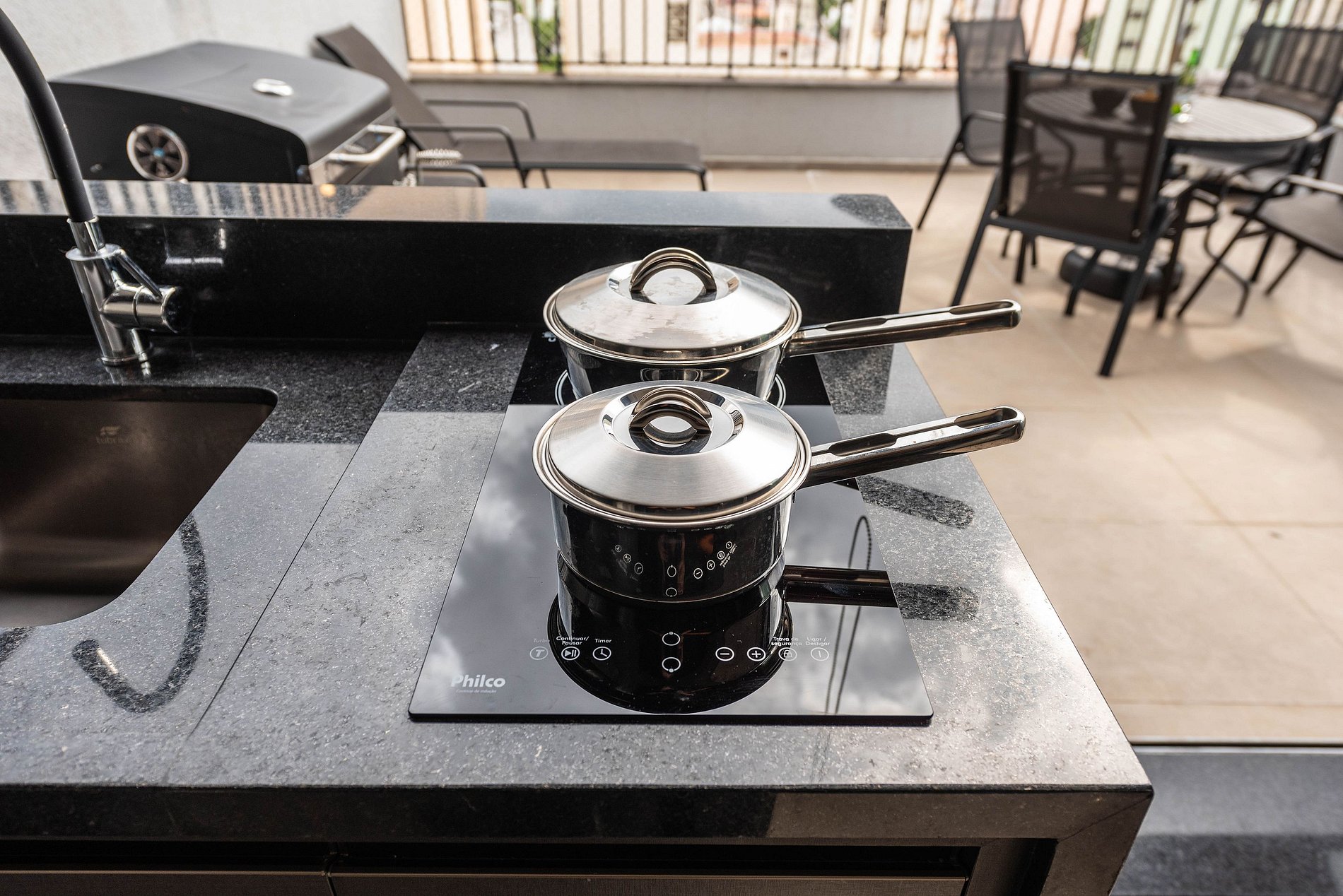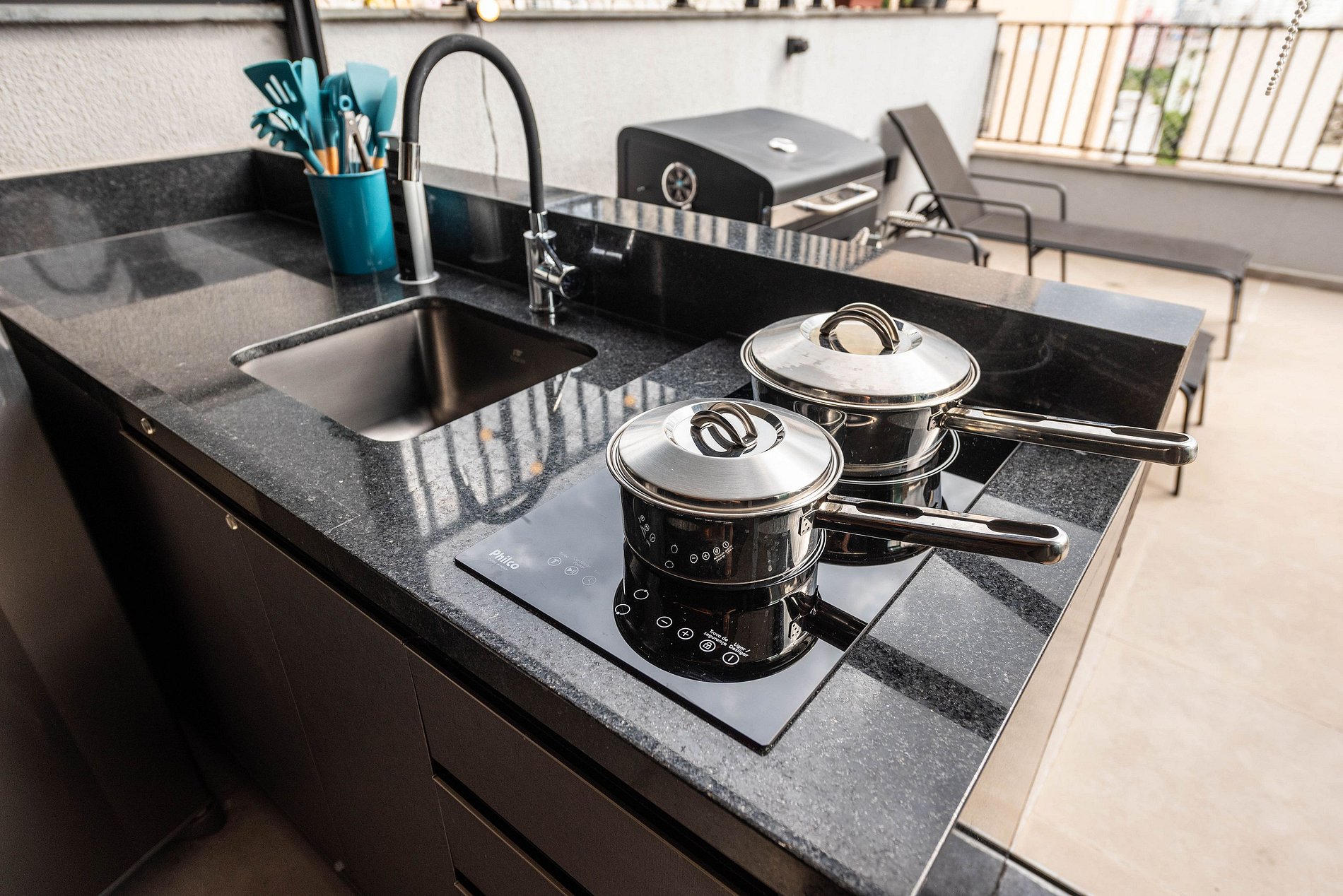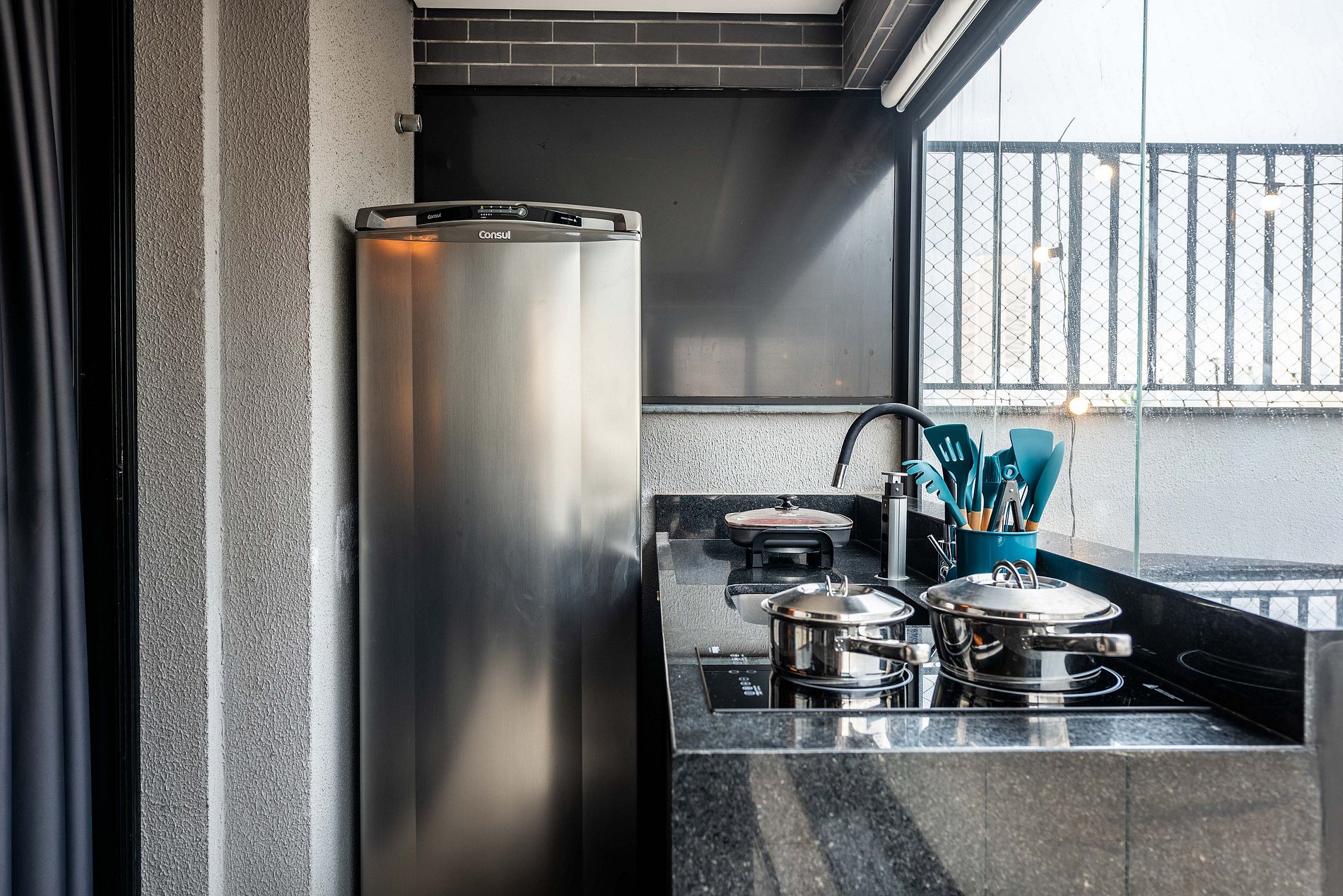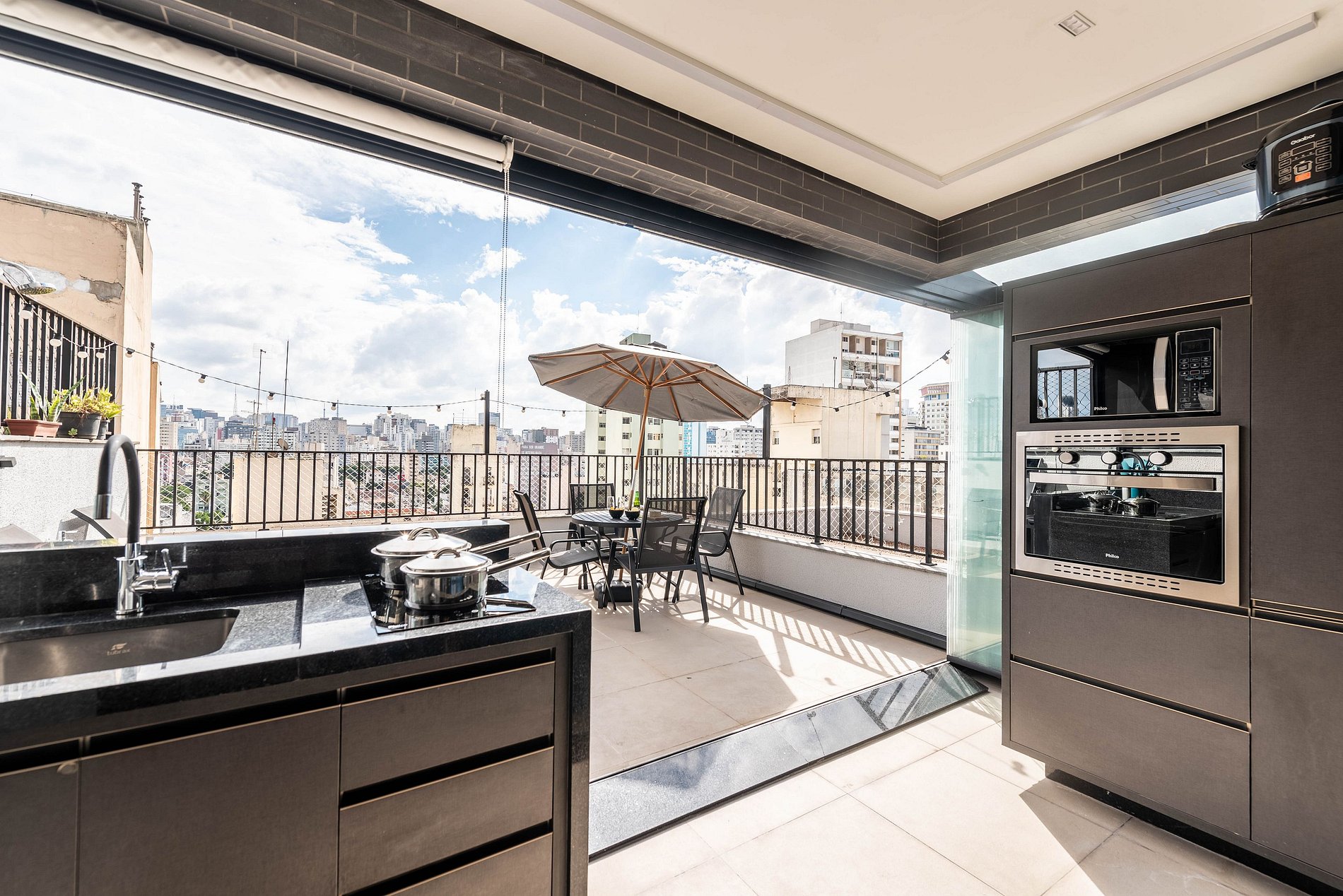 ・Cozinha completa: equipada com frigobar, fogão de indução, micro-ondas etc.