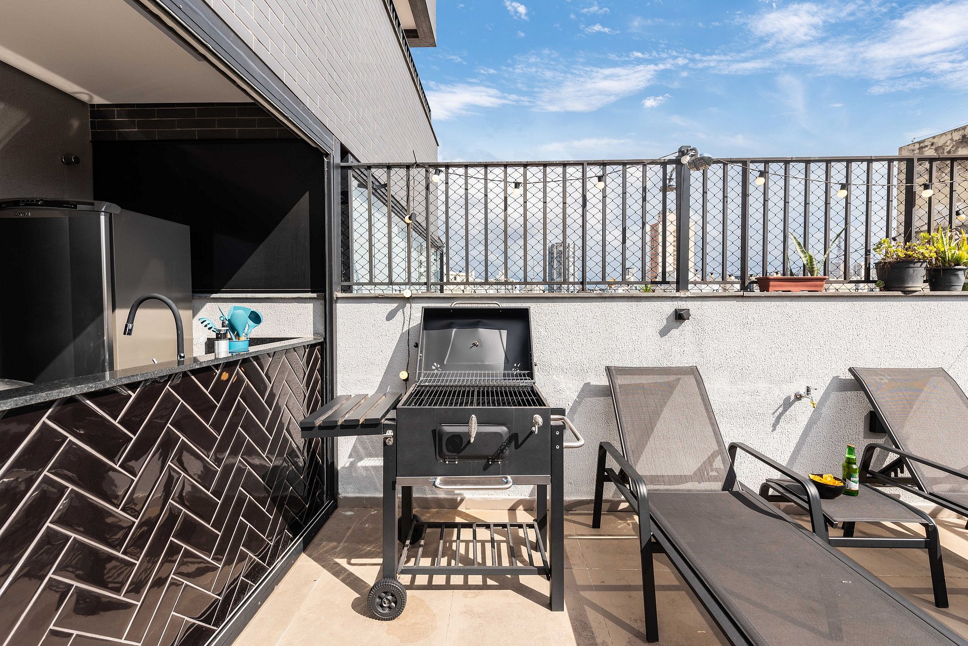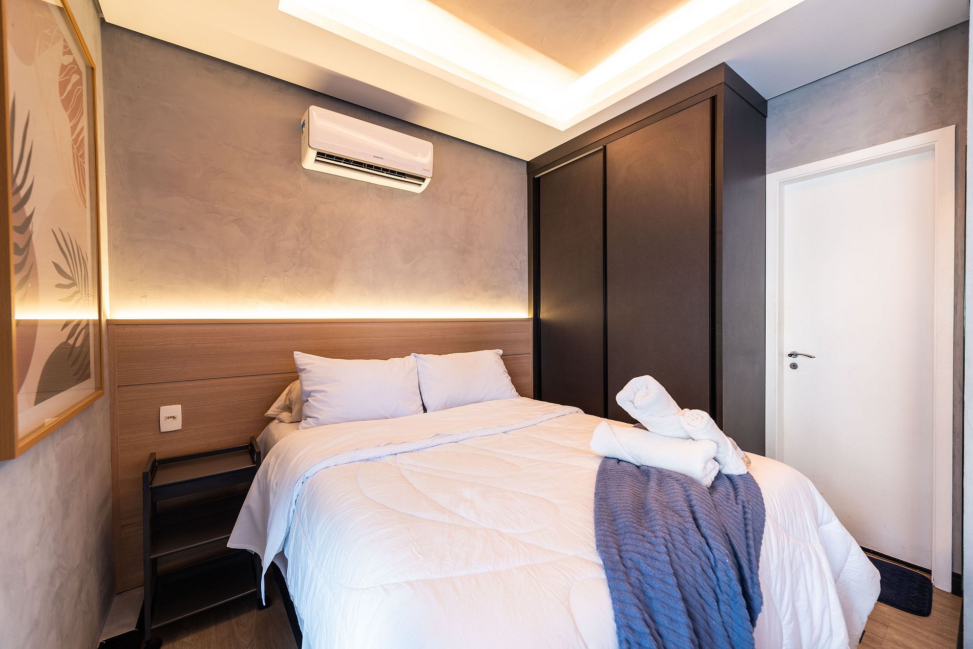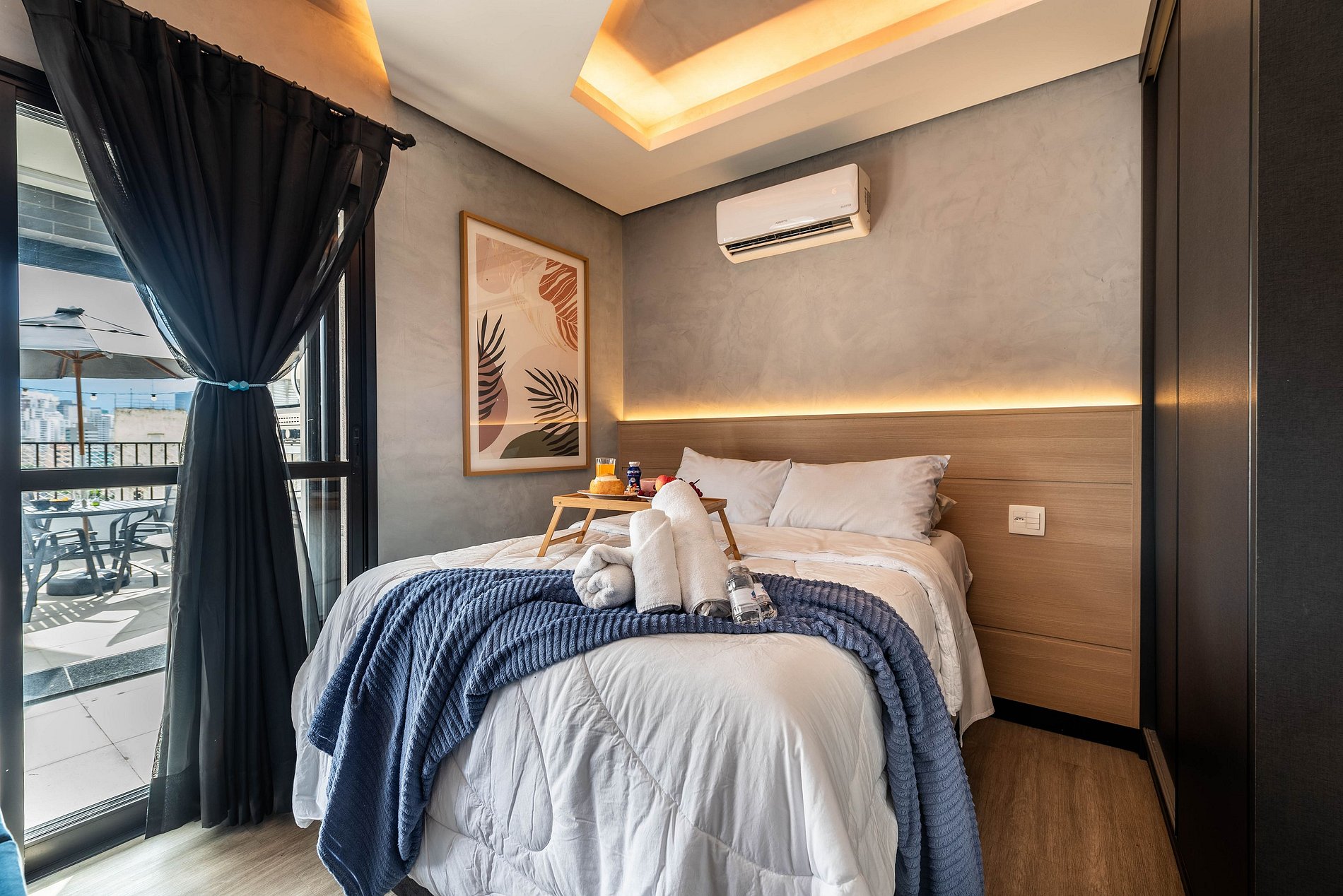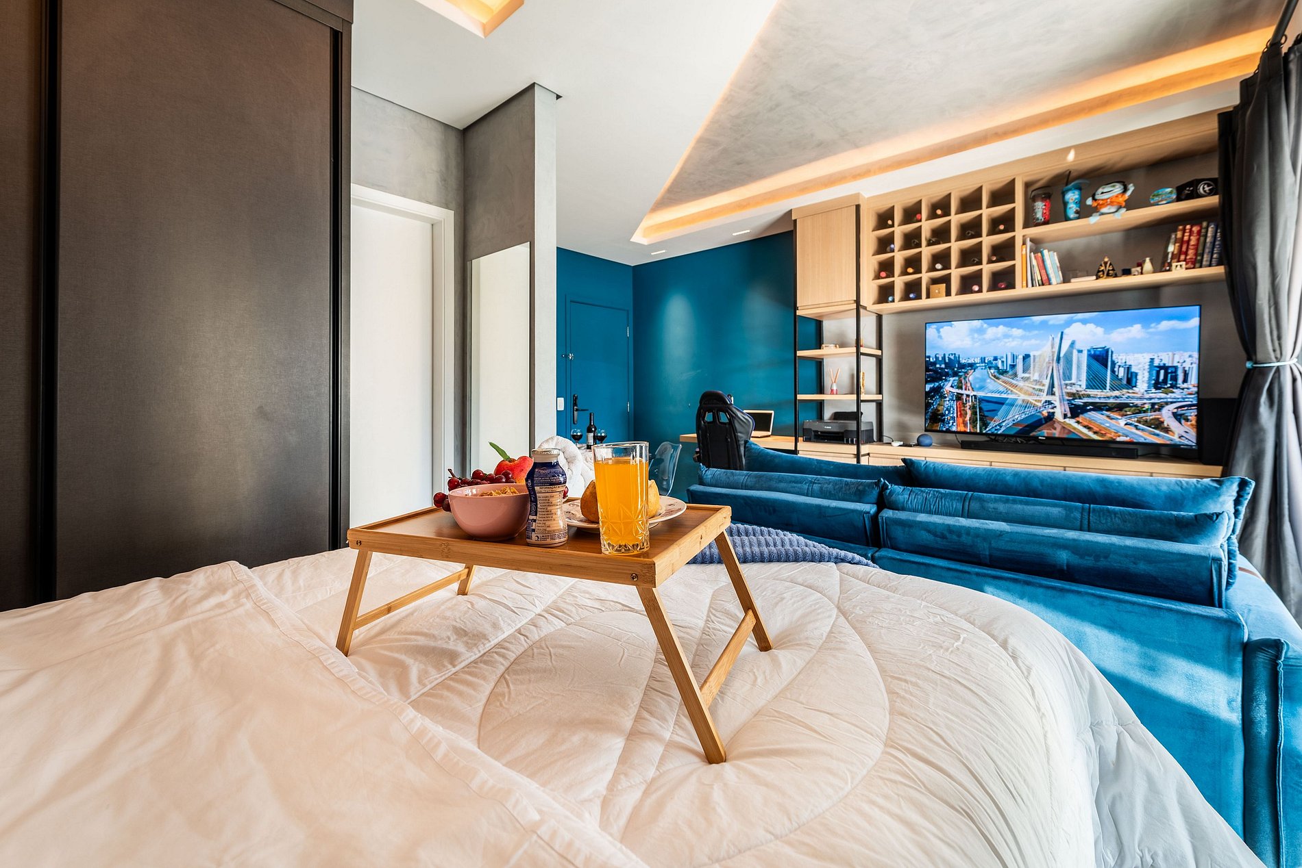 ・Cozinha completa: equipada com frigobar, fogão de indução, micro-ondas etc.